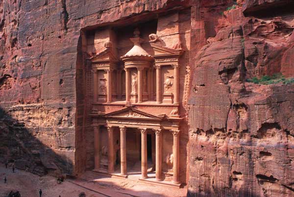 Ein eigenes Kapitel ist der roten Felsenstadt Petra zu widmen. Der UNESCO-Weltkulturstätte gebührt der ganze Stolz Jordaniens und erst jüngst wurde sie für die Wahl der neuen Sieben Weltwunder nominiert. Vor mehr als 2000 Jahren hämmerten die Nabatäer, ein hochentewickeltes arabische Volk, eine riesige Stadt mit Wohngebäuden, Begräbnishallen, Tempeln und Bädern in den in den Sandstein einer tiefen Wüstenschlucht. Der bekannteste Bau Petras ist das sogenannte Schatzhaus, dessen klassiszistisch-hellenistisch angehauchte Fassade sich über 43 mal 30 Meter erstreckt.