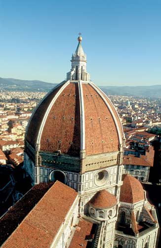 Es ist schier unmöglich, alle sehenswerten Paläste und Piazzas in Florenz in diesem Text zu beschreiben, es gibt ihrer zu viele und sie alle bestechen auf ihre ganz eigene Art. Deshalb wollen wir uns vor allen Dingen auf die klassischen Hauptattraktionen der Stadt konzentrieren, das, was man gesehen haben muss, wenn man in Florenz war. Schon von weitem macht sich die große rote Kuppel des Doms über der Altstadt bemerkbar. Er ist das Herz des historischen Florenz, das seit 1982 auf der UNESCO-Liste des Weltkulturerbes steht. Rund 200 Jahre arbeiteten die Dombaumeister an dem reich mit Marmor verkleideten Gotteshaus, das zu Beginn des 15. Jahrhunderts mit einer markanten Kuppel gekrönt wurde. Den Besucher wird erstaunen, das, auch im Innenraum, nichts an die für die Erbauungszeit typischen gotischen Stilelementen zu finden ist, statt Leichtigkeit herrscht Monumentalität vor. Rund 25.000 Menschen finden auf der über 8000 Quadratmeter großen Fläche des Domes Platz, der damit nach der Peterskirche und dem Mailänder Dom das drittgrößte Gotteshaus Italiens ist.