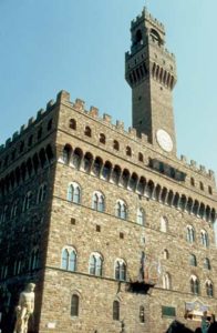 Die gesamte Selbstsicherheit und Macht des florentinischen Bürgertums strahlt der Palazzo Vecchio an der, von Straßencafés gesäumten, Piazza della Signoria aus. Der wehrhafte mit Natursteinen verblendete Bau mit seinem filigranen Turm, beherbergte zunächst den Sitz der Kommunalregierung, bevor er im 16. Jahrhundert vom Medici Cosimo I. als Palast genutzt wurde. Vor der Fassade wurden zahlreiche Statuen aufgestellt darunter auch eine Kopie von Michelangelos David aus dem frühen 16. Jahrhundert. In den Innenräumen des Palastes empfängt einen die geballte Kunstleidenschaft Florenz. Die prächtig ausstaffierten Räume bestechen durch zahlreiche kostbare Gemälde, Skulpturen, Fresken und feinstes Mobiliar. Besonders sticht der große Ratssaal der Fünfhundert hervor, an dessen Decke 39 Felder mit allegorischen Darstellungen der Geschichte von Florenz und der Medici geschmückt sind.