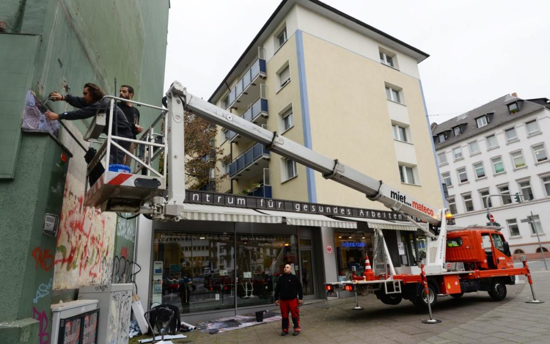 In der "Alten Gasse" in Frankfurt wird eine Installation der Künstler von SBAGLIATO angebracht. Bild: Air Dolomiti/SBAGLIATO.