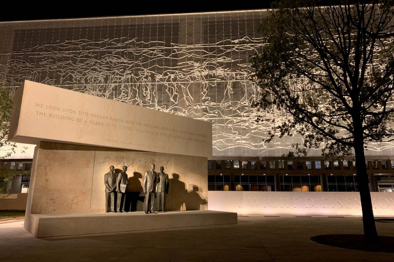 Frank Gehry, der weltbekannte Gebäude wie das Guggenheim Museum in Bilbao entwarf, hat einem der einflussreichsten US-Präsidenten ein Denkmal gesetzt. Das Dwight D. Eisenhower Memorial befindet sich in einem neu angelegten, vier Hektar großen Park neben der National Mall und gegenüber des Smithsonian National Air and Space Museums in Washington, DC. Die Gedenkstätte versammelt drei bronzene Statuen des Künstlers Sergey Eylanbekov mit Stationen aus Eisenhowers Leben sowie ein Steinbas-Relief mit Zitaten Eisenhowers. An der Fassade des Gebäudes hinter dem Memorial vervollständigt eine abstrakte Darstellung der Pointe du Hoc in der Normandie von Thomas Osinski, das Gesamtkunstwerk.