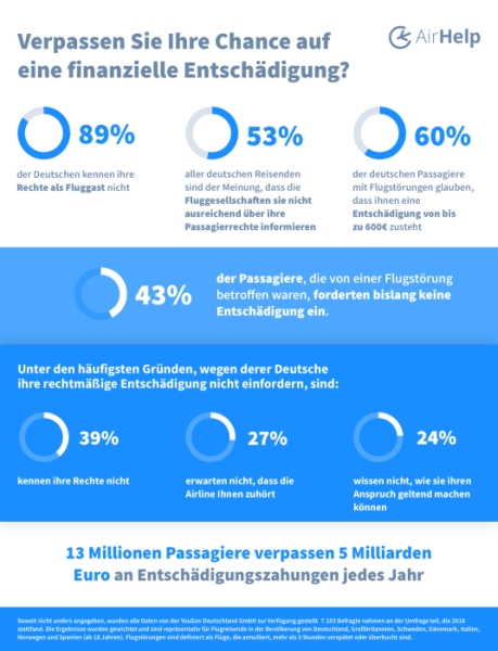 Der häufigste Grund, wegen dem deutsche Fluggäste ihre rechtmäßige Entschädigung nicht einfordern, ist ihre Unkenntnis über ihre Rechte. Das gaben 39 Prozent derer an, die eine Entschädigung in der Vergangenheit nicht bei der verantwortlichen Airline eingefordert haben. 27 Prozent erwarteten zudem nicht, dass die Fluggesellschaft ihnen zuhören würde und 24 Prozent wussten nicht, wie der Anspruch auf eine Entschädigung durchgesetzt werden kann. Insgesamt versuchten bislang nur knapp die Hälfte der deutschen Flugreisenden, die von einer Flugstörung betroffen waren, von ihrem Recht auf eine finanzielle Entschädigung Gebrauch zu machen.