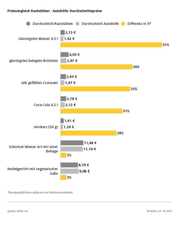 Der ADAC hat die Preise von 70 Raststätten und Autohöfen an deutschen Autobahnen verglichen. Das Ergebnis: Von 14 untersuchten Produkten waren 13 im Durchschnitt an Raststätten teurer. Die 0,5-Liter-Wasserflasche lag beispielsweise 51 Prozent über dem Preis der Autohöfe. Das belegte Brötchen, ein süß gefülltes Croissant und eine Flasche Cola waren im Durchschnitt in der Raststätte ca. ein Drittel teurer. Allerdings muss für die Anfahrt des Autohofes die Autobahn verlassen werden.
