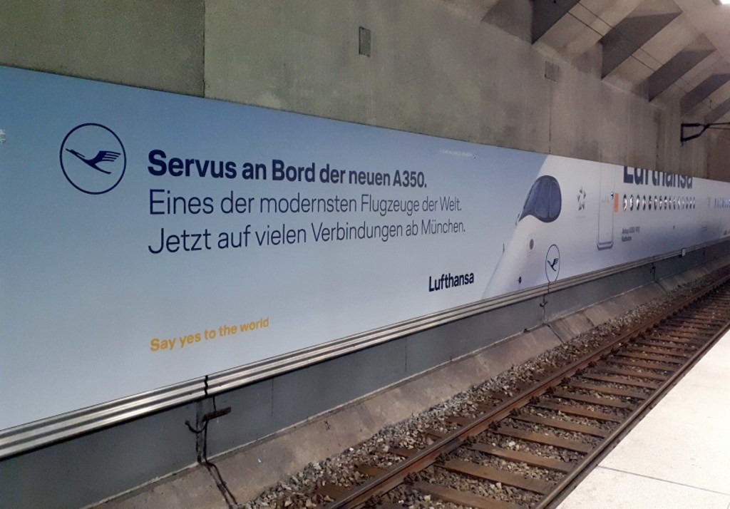 Schon mal den Airbus A350-900 in einem S-Bahnhof erlebt? Falls nicht: Ab sofort ist das weltweit modernste und umweltfreundlichste Langstreckenflugzeug im S Bahnhof des Münchner Flughafens zu sehen. Die Installation ist jenseits der Gleise angebracht und zeigt auf 230 Metern den Lufthansa Airbus in Originallänge. Das Besondere daran: Die Flugzeugfenster sind mit einer Spiegelfolie ausgestattet, so dass sich die wartenden Fahrgäste am Bahnsteig und in der S-Bahn selbst in der A350-900 sehen können. Flugzeugfans, Passagiere und Besucher des Münchner Flughafens können noch das ganze Jahr die A350-900 im S-Bahnhof des Münchner Flughafens bestaunen.
