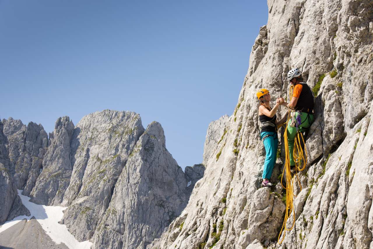 Wer sich zu Fleischbank (2187 m), Predigtstuhl (2115 m) oder Totenkirchl (2119 m) aufmacht, nimmt die berühmtesten Kletterberge des Wilden Kaisers ins Visier. „Hier führt kein Wanderweg hinauf, hier sind nur Kletterer unterwegs – man kann beobachten, wie sie in schier endlosen Felswänden hängen“, sagt Tom Rabl von den Kitzbüheler Bergführern und beschreibt die einzigartige Atmosphäre. Vorbei an diversen Adrenalin-Junkies bringt er seine Gäste am Seil durchs imposante Gelände und führt Schritt für Schritt in die leichte Kletterei der Schwierigkeitsgrade 3 und 4 ein. „Bei uns kommen maximal zwei Teilnehmer auf einen Bergführer“, sagt er und verweist damit auf die hohen Sicherheitsstandards wie auf das exklusive Erlebnis.