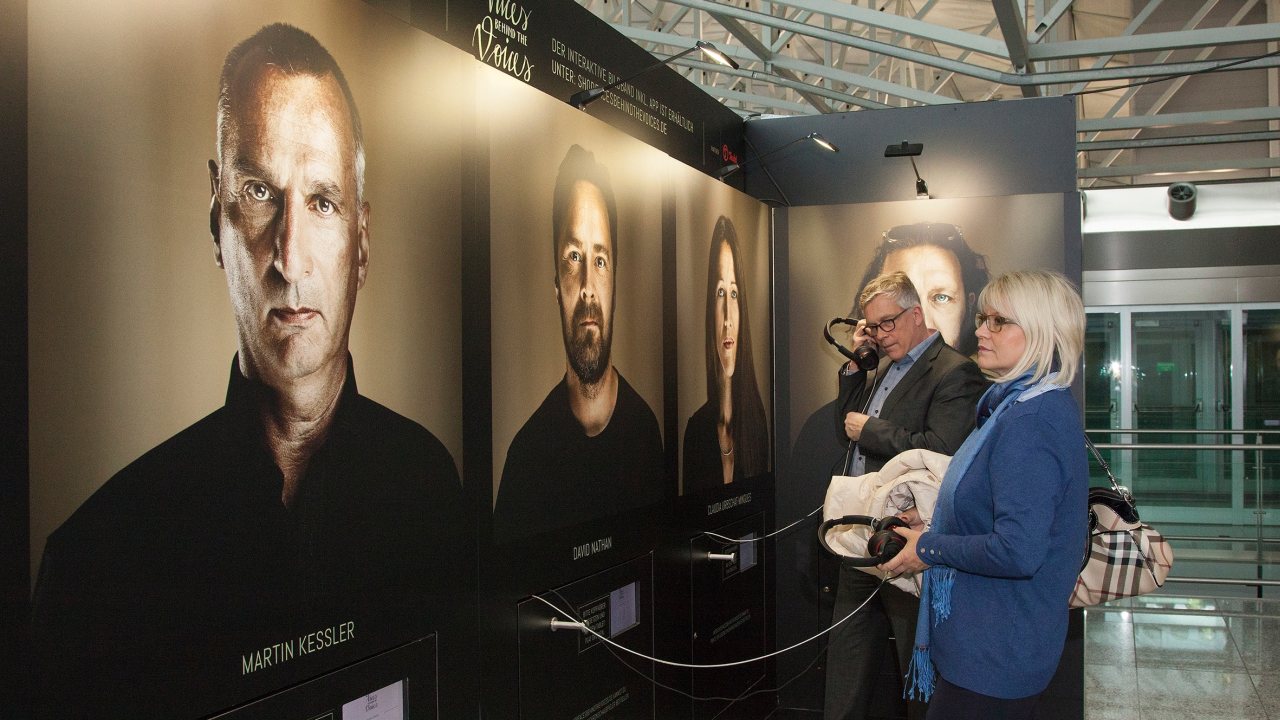 Um den Menschen hinter der Stimme geht es in der interaktiven Ausstellung „Faces Behind The Voices“, die am Flughafen Frankfurt im Terminal 2, Ebene 4 (nahe der SkyLine-Station) zu sehen ist. Sie verleiht den bekanntesten und beliebtesten Synchronstimmen auf dem deutschen Markt ein Gesicht. Die Wanderausstellung, initiiert vom Berliner Fotografen Marco Justus Schöler, porträtiert 30 der bekanntesten Sprecherinnen und Sprecher Deutschlands – alle einheitlich, in schlichter Kleidung und mit neutralem Gesichtsausdruck. Denn: Hier stehen die Stimmen im Vordergrund – und die kennt fast jeder. Angereichert sind die Fotografien mit je einer individuellen Audioaufnahme des Sprechers inklusive originalen Filmzitaten, Anekdoten aus der Branche, lustigen Alltags-Momenten und kleinen, audiovisuellen Rätseln.