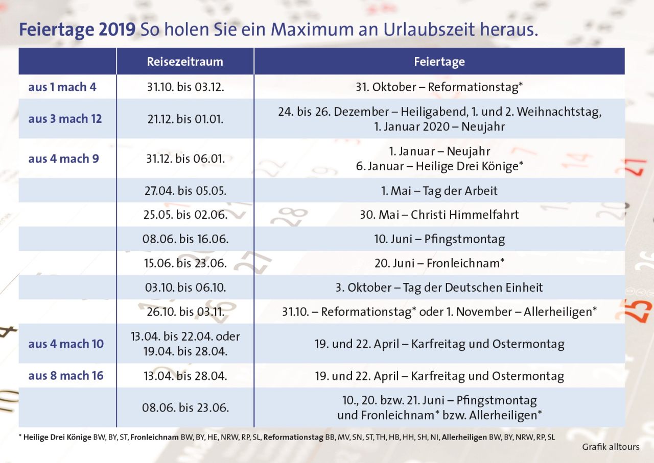 November und Dezember sind erfahrungsgemäß die Monate, in denen die meisten Arbeitnehmer ihren Urlaub für das kommende Jahr planen. Auch, wenn noch nicht sicher ist, wohin die Reise gehen wird: Mit Hilfe der vielen Feiertage und geschickt gebauten Urlaubsbrücken kann ein Maximum an Urlaub herausgeholt werden. Wie das funktioniert, verrät der Reiseveranstalter alltours in einer übersichtlichen Grafik.