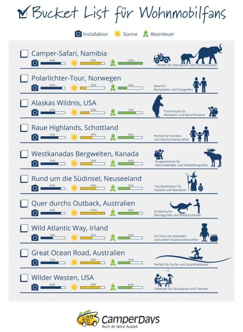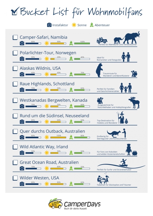 Auf der ganzen Welt gibt es Routen für Weltenbummler, die mit dem Wohnmobil auf Abenteuerreise gehen wollen. Das Online-Reisebüro CamperDays veröffentlicht nun die zehn Lieblingsrouten des Experten-Teams, die jeder Wohnmobil-Fan zumindest einmal im Leben fahren sollte. Die Bucket List umfasst Routen auf verschiedenen Kontinenten und führt in kontrastreiche Landschaften. Detaillierte Informationen zur Wohnmobil-Bucket List von CamperDays, wie Reisedauer, Streckenverlauf und empfohlener Reisezeitraum gibt es online unter www.camperdays.de/blog/aus-aller-welt/wohnmobil-touren.html.