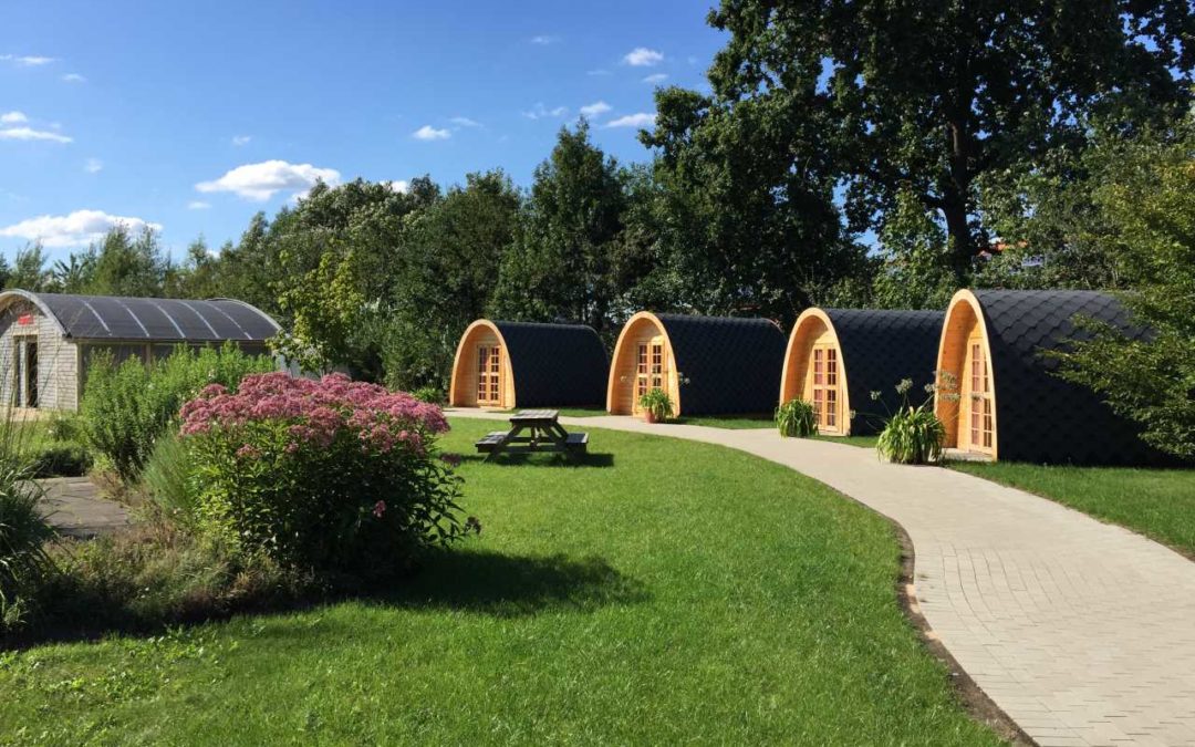 Die halbrunden Holzfässer (Camping Pods) im Gartenschaupark Rietberg werden um kleine Hexenhäuschen ergänzt. Bild: © Gartenschaupark Rietberg GmbH.
