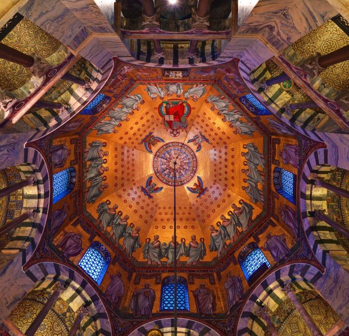 360-Grad-Panorama-Aufnahme aus dem Aachener Dom mit Blick zur Decke des Oktogon. Bild: © Tourismus NRW e.V.