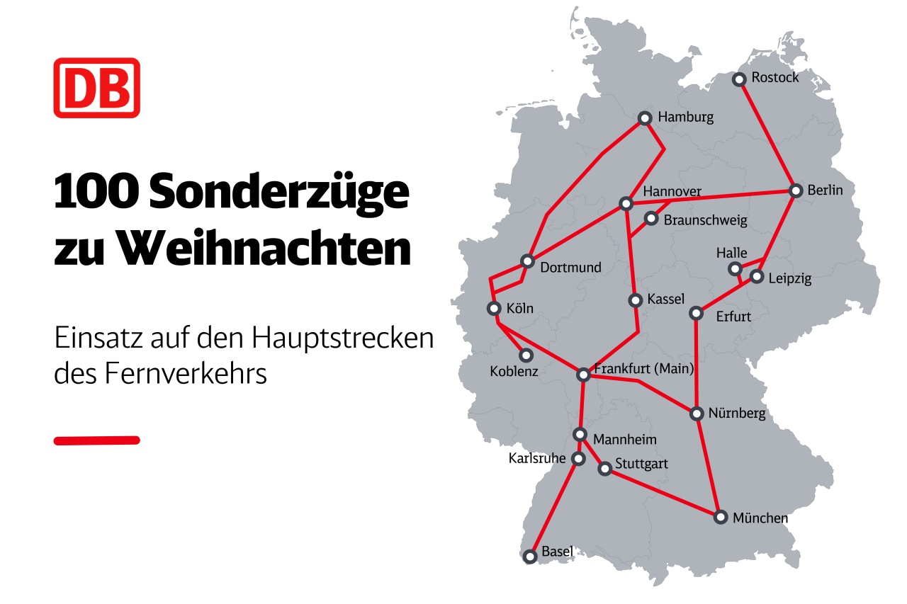 Die Deutsche Bahn macht mit einem umfassenden Maßnahmenpaket das Reisen zu Weihnachten sicher. Hierfür werden auf den Hauptachsen des Reiseverkehrs zwischen dem 18. und 27. Dezember 2020 rund 100 Sonderzüge eingesetzt, um den Reisenden möglichst viel Platz zu bieten. Zudem erhöht die DB die Präsenz von Sicherheitskräften weiter: In bis zu 50 Prozent aller Fernverkehrszüge sind Sicherheitsteams an Bord, um auf die Einhaltung der Maskenpflicht hinzuweisen.