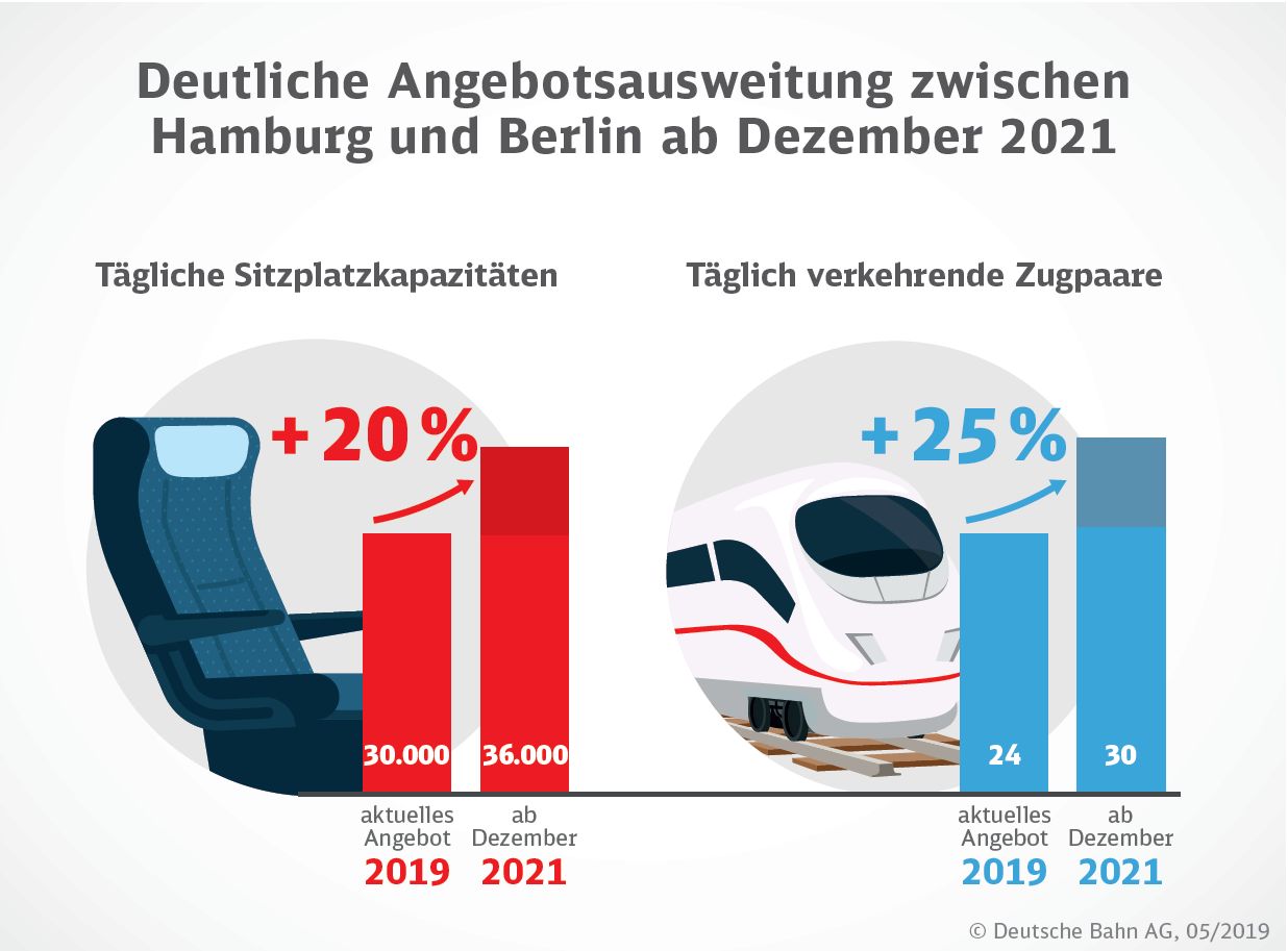 Die Deutsche Bahn AG (DB) will zum Fahrplanwechsel im Dezember 2021 einen Halbstundentakt zwischen Hamburg und Berlin einführen. Die Verbindung zwischen den Metropolen Hamburg und Berlin zählt mit täglich fast 17.000 Fahrgästen zu den nachfragestärksten Fernverkehrsverbindungen in Deutschland. Für die Angebotserweiterung führt die DB zum Fahrplanwechsel im Dezember 2021 eine neue ICE-Linie zwischen Hamburg und Berlin ein, auf der täglich sechs Züge pro Richtung verkehren werden. Die neue Linie ergänzt dann die aktuell drei Linien, auf der insgesamt 24 Züge täglich pro Richtung verkehren (ICE-Linie Hamburg–Berlin–Halle–München, ICE-Linie Hamburg–Berlin–Leipzig–München sowie die EC-Linie Hamburg–Berlin–Prag). Die drei bisherigen Linien bleiben im Umfang unverändert bestehen. (DB)