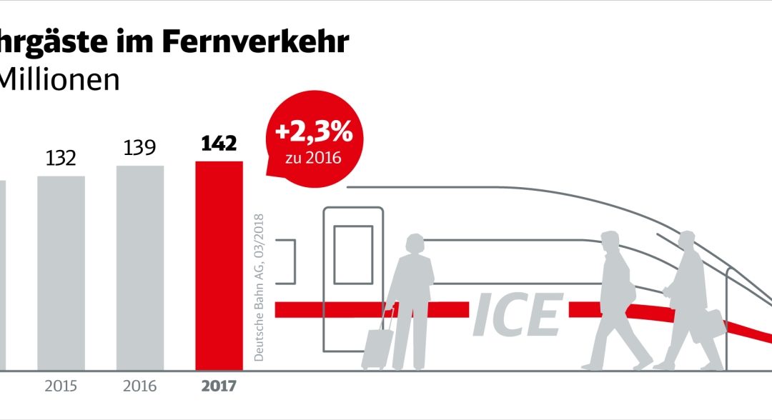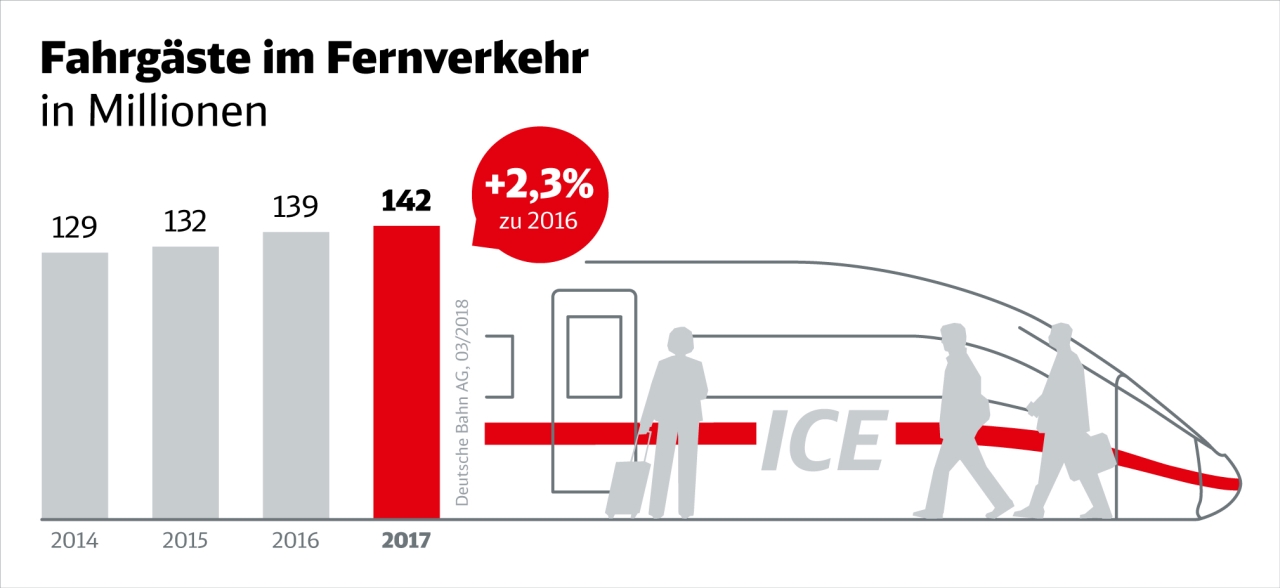 Im Schienenpersonenfernverkehr ist die Zahl der Passagiere im Vergleich zum Vorjahr um 3,2 Millionen gestiegen. Über 142 Millionen Fahrgäste (Vorjahr: 139 Millionen) reisten in den Fernverkehrszügen der DB (+2,3 Prozent). Auch europaweit ging die Zahl aller Reisenden in den Zügen und Bussen der DB signifikant nach oben – um 5,3 Prozent auf knapp 4,7 Milliarden Passagiere.
