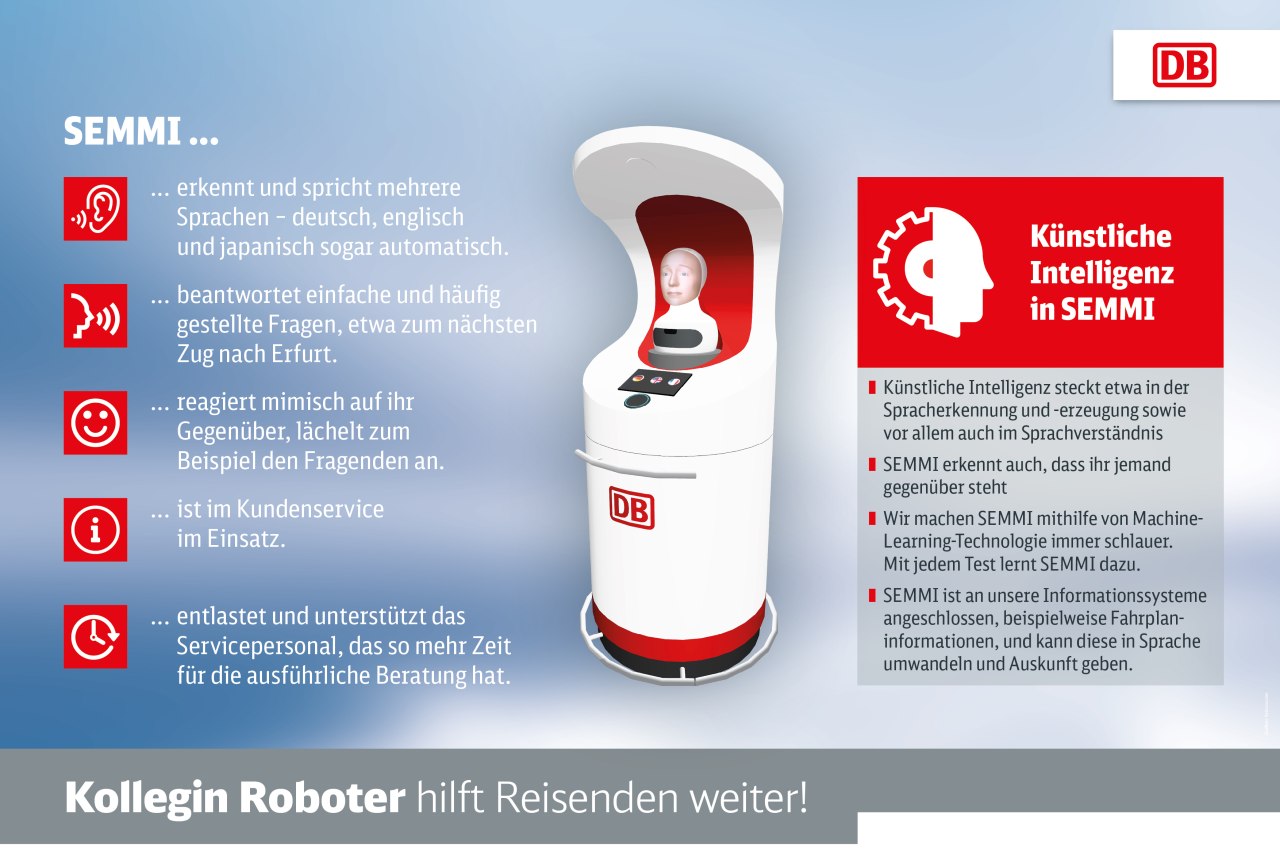 SEMMI steht für „Sozio-Emphatische Mensch-Maschine-Interaktion“. Neben Informationen zur Reise kann SEMMI auch Small Talk. Fragen erkennt und beantwortet sie dabei auf Deutsch und Englisch automatisch. Bei Bedarf beherrscht sie weitere Sprachen wie Französisch, Polnisch, Spanisch und Italienisch. Besondere Mächtigkeit kommt KI-Sprachsystemen wie sie in SEMMI stecken auch bei größeren Störungen zu, zum Beispiel nach Unwettern. Die DB setzt hier daher verstärkt auf neue Technologien, um auch in diesen Fällen ihren Kunden in „Echtzeit“ mit Rat und Tat zur Seite zu stehen. (DB)