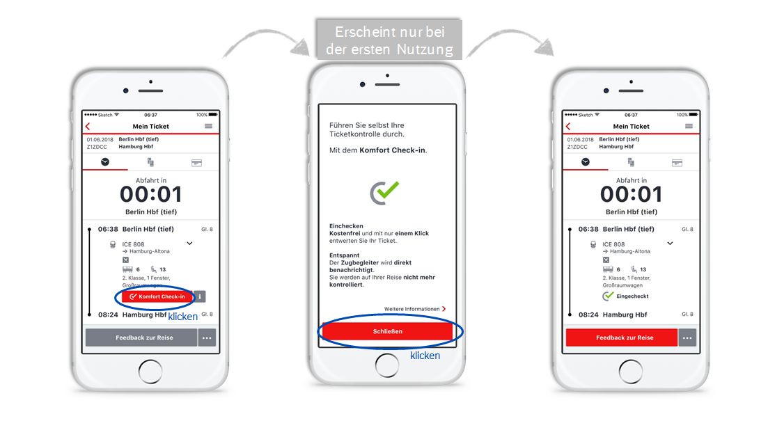 Kunden der Deutschen Bahn, die gerne ungestört reisen möchten, können sich mit dem neuen digitalen Service Komfort Check-in (KCi) selbst im ICE einchecken. Fahrgäste, die den Service nutzen, reisen ohne ungewollte Unterbrechungen durch die Ticketkontrolle – auch nach Personalwechsel. Die Zugbegleiterinnen und Zugbegleiter haben durch den Wegfall der Kontrolltätigkeit mehr Zeit für persönlichen Kundenservice, wie beispielsweise Auskünfte zum Reiseverlauf oder umfangreichere Informationen während der Fahrt.