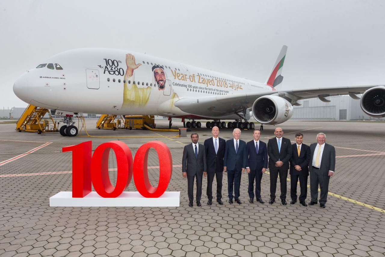 Emirates bekommt seine 100. A380: Im Rahmen einer festlichen Zeremonie feierten hochrangige Vertreter von Emirates und Airbus am 03. November 2017 den Meilenstein am Standort des Flugzeugherstellers in Hamburg.