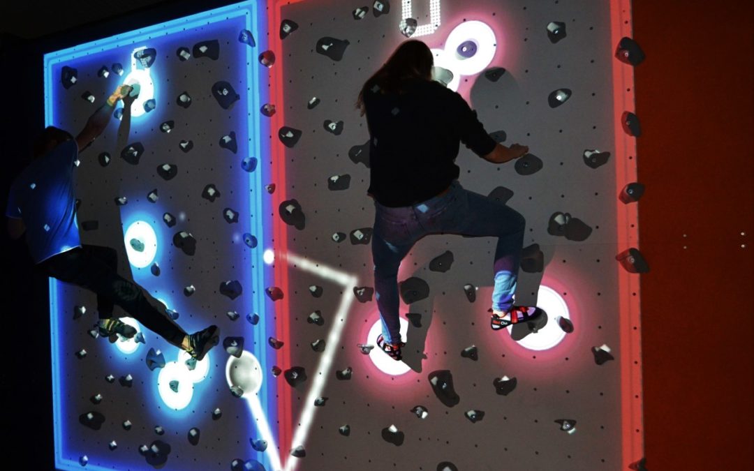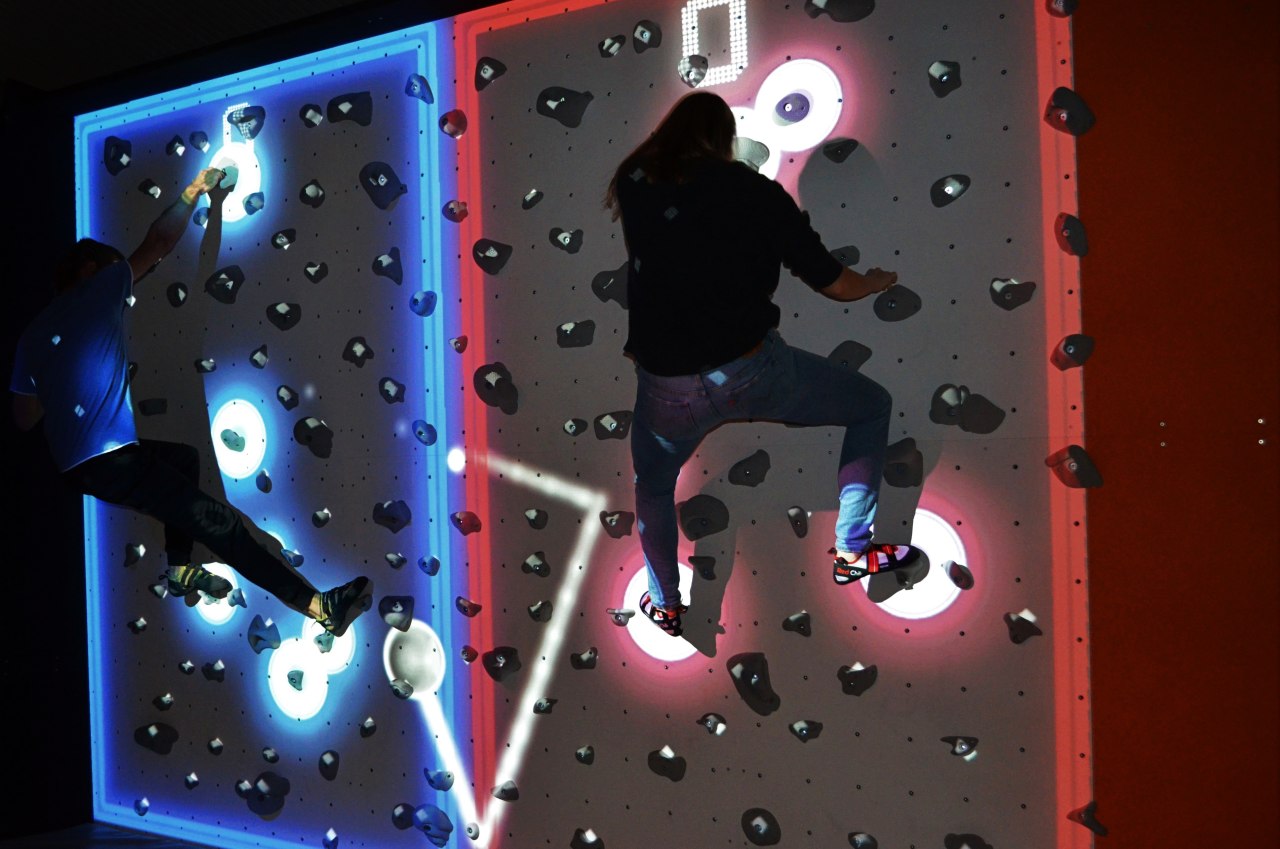 In Dortmund gibt’s für Kletterfans jetzt eine neue Herausforderung: In der kürzlich eröffneten Augmented Climbing Hall verwandeln sich Kletterwände mithilfe einer neuen Technologie in interaktive Spielflächen. Mit einem Beamer werden dabei verschiedene Spiele auf die Wand projiziert und über Touchscreen und Tiefenscanner ausgewertet. So können Kletterer sich zum Beispiel gegenseitig einen Ball zu werfen, um die Wette sich bewegende Punkte berühren oder einer Linie ausweichen. Die neue Technologie wurde in Finnland erfunden und ist nach Angaben der Dortmunder Betreiber erstmals in Deutschland verfügbar.