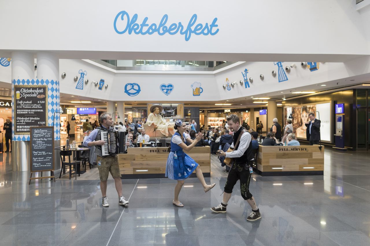 Zur authentischen Festzelt-Atmosphäre tragen original Trachten sowie bayerische Live-Musik bei. Dazu passend gibt es für viele Shops attraktive Coupons und Rabatte zum Einkaufen und Punkte sammeln im Rewards Programm, Mitmach-Spiele und – von Weißwurst und Brezen bis zur frisch gezapften Maß Bier – typische kulinarische Angebote in den Restaurants und Bistros. Mit Zuckerschrift individuell verzierte Lebkuchenherzen gehen mit den Passagieren auf die Reise in alle Welt. (Fraport)