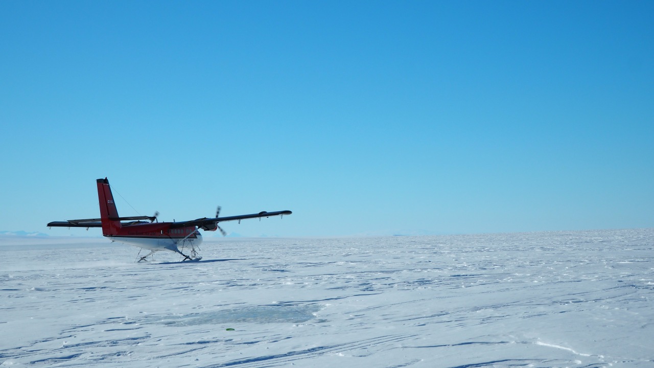 Ein DHC-6 Twin Otter Flugzeug bei der Landung auf dem Ross Schelfeis. Die Schelfeisoberfläche ist von Sastrugis (Erhebungen, die durch windbedingte Abtragungen von Schnee entstehen) bedeckt. Bild. DLR/Twin Otter.