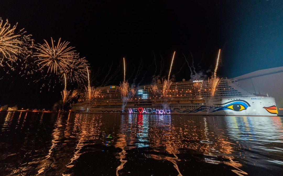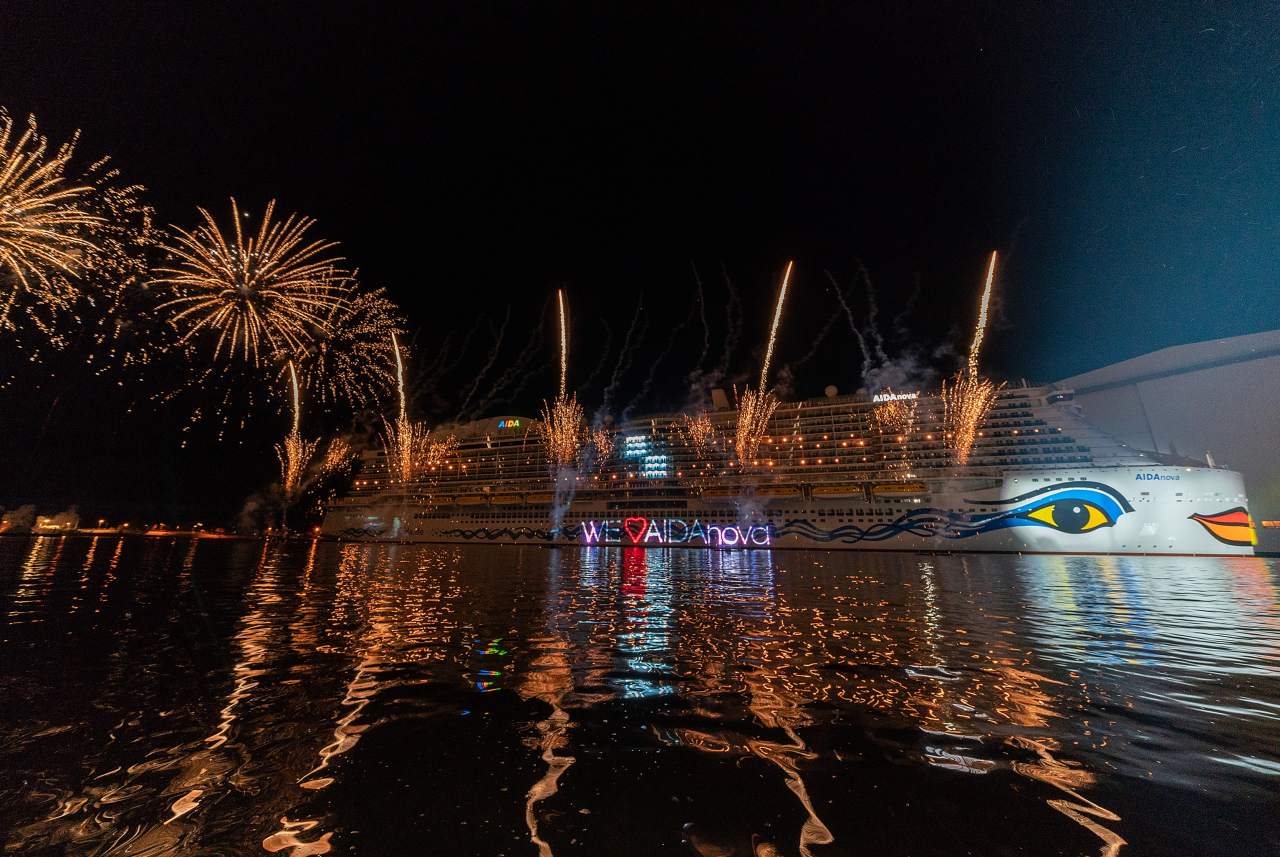 AIDAnova wurde vor der Werfthalle in Papenburg mit Licht- und Lasereffekten eindrucksvoll in Szene gesetzt. Mit einer beeindruckenden Lasershow erwachte das Schiff zum Leben. Die 20 mehrfarbigen Laser-Projektoren, über 300 Stroboskope sowie mehr als 100 Scheinwerfer und Spotlights ließen das Schiff erstrahlen. Wasser-Akrobaten stiegen mit ihren leuchtenden Flyboards in 20 Meter Höhe auf, glitten über die Wasseroberfläche und warfen mit erstaunlichen Stunts Fontänen in die Luft.
