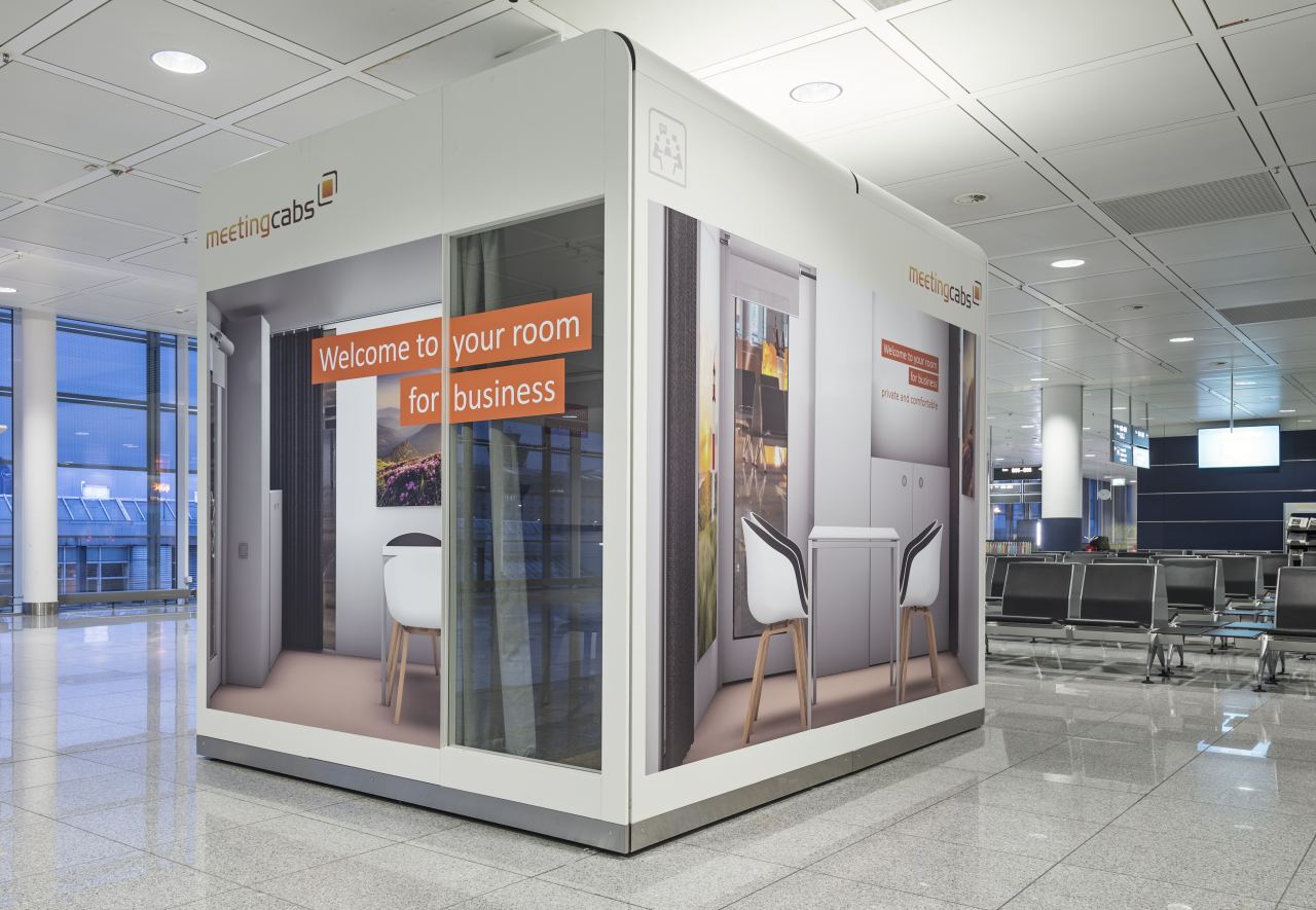 Die „MeetingCab“ befindet sich im Norden des Terminals auf der Schengen-Ebene in Höhe des Gates G 06 und bietet die für vertrauliche Gespräche oder Telefonate benötigte Privatsphäre. In der hell gestalteten, etwa acht Quadratmeter großen schallisolierten Kabine finden vier Personen an einem Besprechungstisch Platz. Sie können auf eine Netzwerkverbindung und mehrere Stromanschlüsse zugreifen und sich mit Vorhängen vor neugierigen Blicken schützen. Die ersten 30 Minuten Nutzung kosten 15 Euro, je weitere 30 Minuten fallen fünf Euro an. Gezahlt wird direkt an der Kabine. Außerdem haben Kunden die Möglichkeit die „MeetingCab“ vorab unter www.meetingcabs.com online zu buchen. Das Konzept stammt vom Hersteller der am Flughafen bewährten „NapCabs“-Schlafkabinen und wird zunächst für ein Jahr getestet. (Flughafen München)