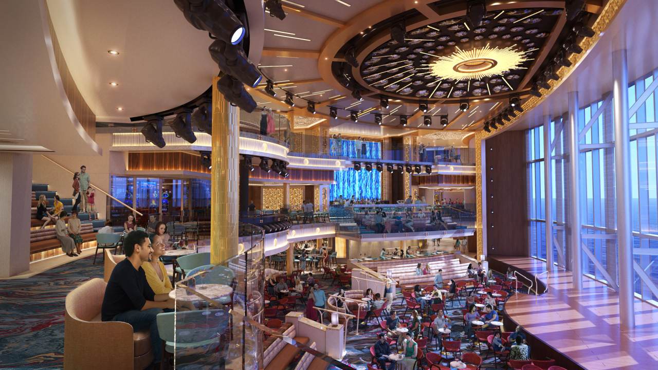 Eine der spektakulärsten ist das riesige, über drei Decks ausgelegte Atrium Grand Central, das an der Steuerbordseite durch eine über rund 280 Quadratmeter reichende Fensterfront begrenzt wird. Diese bietet einen atemberaubenden Blick aufs offene Meer.