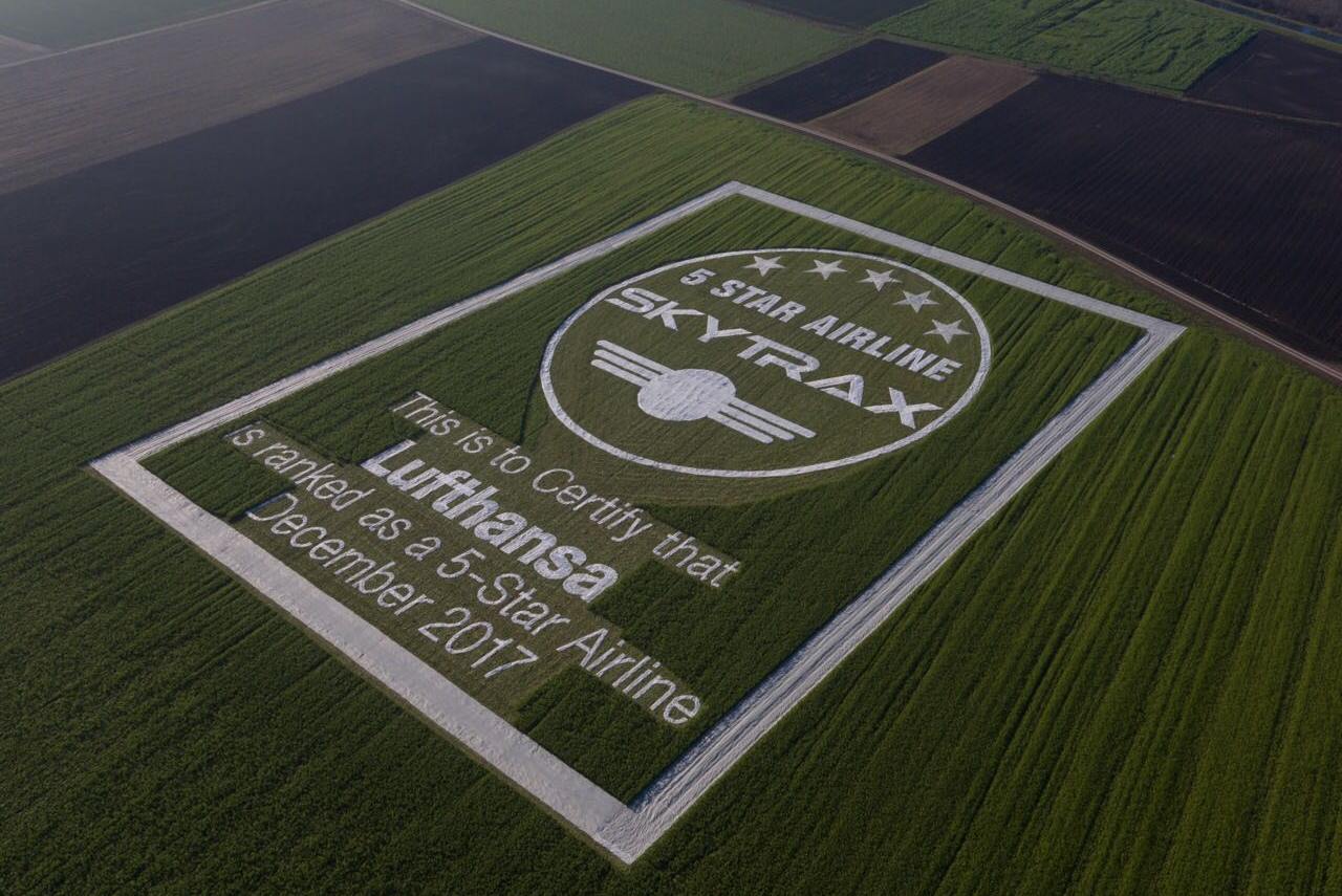 Sie ist so groß, dass man sie nur aus der Luft erkennen kann: Die vermutlich größte Urkunde der Welt, deren Original vor einer Woche an Lufthansa übergeben wurde. Die Auszeichnung des Skytrax-Instituts weist jetzt auch in überdimensionaler Form darauf hin, dass Lufthansa als bisher einzige Airline in Europa den 5. Stern erhalten hat – das höchste Qualitätssiegel in der internationalen Luftfahrt. Dafür hat der Künstler Heinrich Bunzel für Lufthansa ein 70.000 Quadratmeter großes Feld aus biologisch abbaubarem Textilfließ gestaltet. Die Urkunde liegt in der östlichen Einflugschneise des Münchner Flughafens zwischen der nördlichen und der südlichen Landebahn und kann noch vier Wochen aus der Luft entdeckt werden.