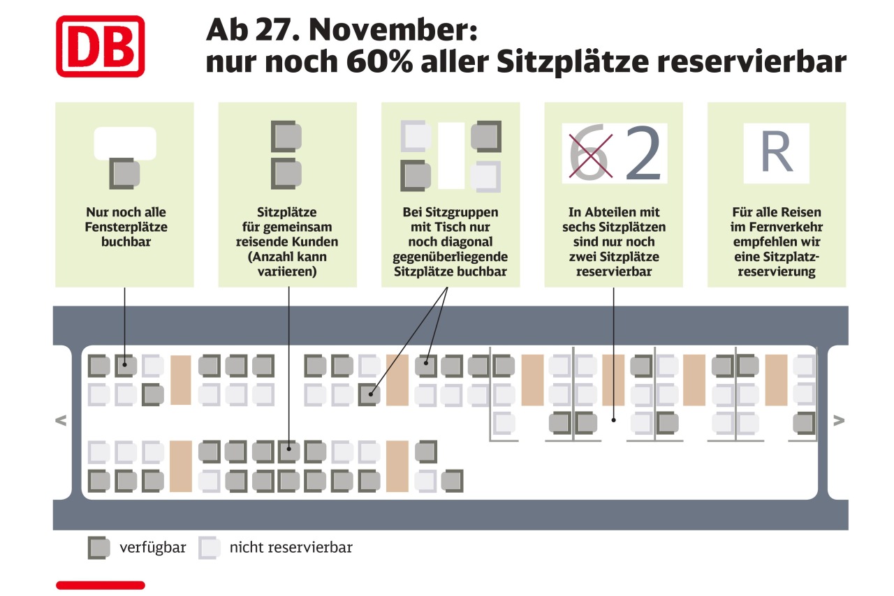 Neu ab morgen (27.11.): In allen Zügen ist in den Großraumwagen nur noch ein Sitzplatz pro Doppelsitz reservierbar. Alle anderen Sitzplätze bleiben für eine Reservierung gesperrt. Einzelreisenden werden automatisch Fenstersitzplätze zugewiesen. Bei Sitzgruppen mit Tisch können nur noch die diagonal gegenüberliegenden Sitzplätze gebucht werden (Fensterplatz auf der einen Seite und Gangplatz auf der gegenüberliegenden Seite). Reservierungen von Einzelreisenden auf nebeneinander liegenden Sitzplätzen werden so vermieden. In geschlossenen Abteilen mit sechs Sitzplätzen sind nur noch zwei Plätze reservierbar, der Fensterplatz auf der einen und der Gangplatz auf der anderen Seite. Insgesamt bietet die DB nur noch 60 Prozent der Sitzplätze zur Reservierung an.