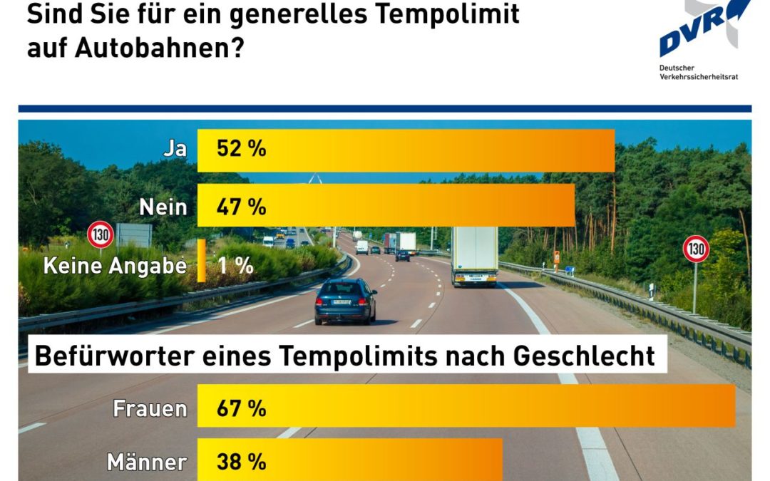 Über die Hälfte der Autofahrerinnen und Autofahrer (52 Prozent) ist der Meinung, dass es in Deutschland ein generelles Tempolimit auf Autobahnen geben sollte. Dies ergab eine repräsentative Befragung, die im Auftrag des Deutschen Verkehrssicherheitsrates (DVR) im Juni 2017 vom Marktforschungsinstitut Ipsos bei 2.000 Personen über 18 Jahren durchgeführt wurde. Nur eine geringe Minderheit (ein Prozent) hat zu der Frage keine Meinung. Ebenfalls 52 Prozent aller Befragten gaben an, dass mit einem Tempolimit die Zahl der Verkehrstoten gesenkt werden könnte. Im Jahr 2016 sind 393 Menschen auf deutschen Autobahnen ums Leben gekommen.