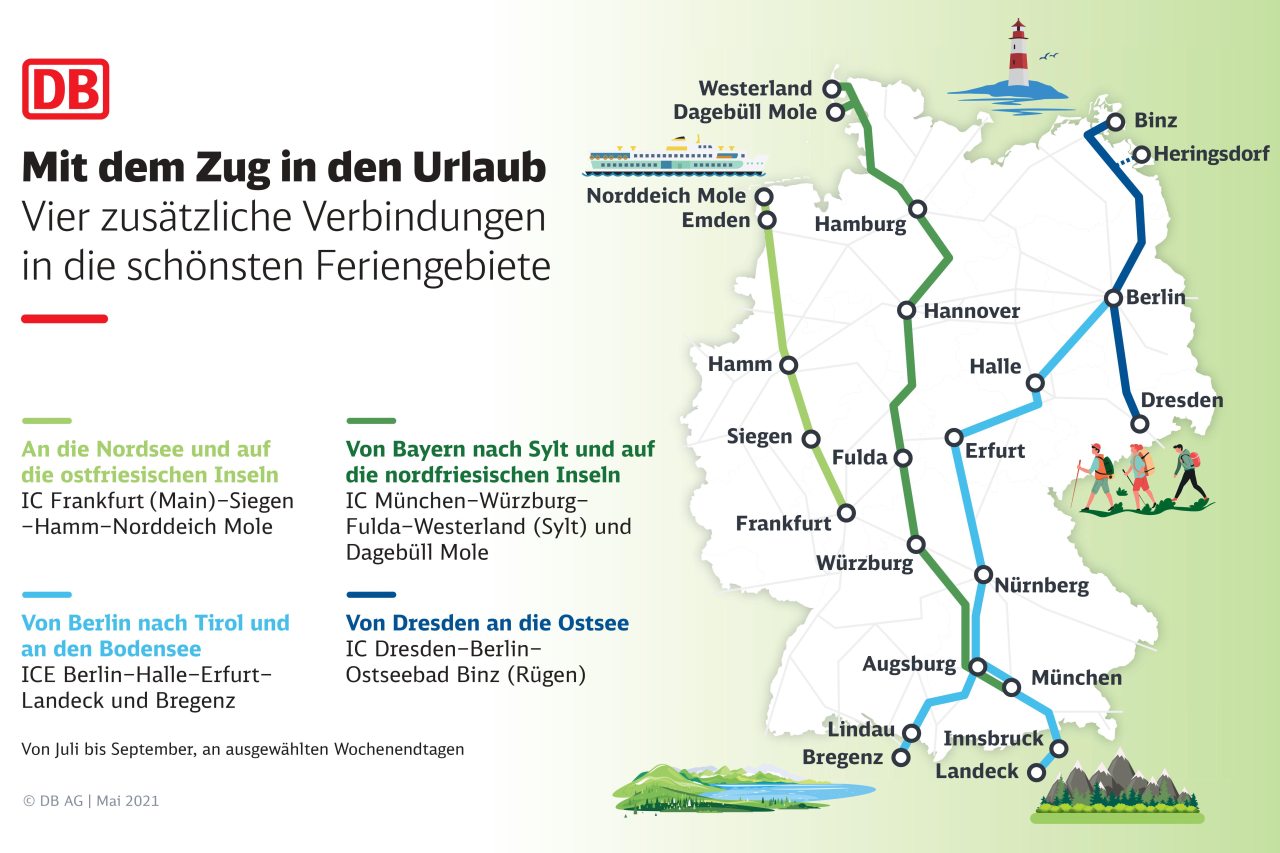 Die Bahn hat ihre Planungen für den Sommerfahrplan 2021 abgeschlossen. Ab Anfang Juli bietet die DB ihren Reisenden zahlreiche zusätzliche Verbindungen in beliebte Ferienregionen Deutschlands und nach Österreich an. Urlaubsziele wie Rügen, die ost- und nordfriesischen Inseln, Tirol und der Bodensee sind noch öfter, bequemer und schneller erreichbar. Zusammen mit weiteren saisonalen Verbindungen stehen damit täglich über 10.000 Sitzplätze zusätzlich in den ICE- und IC-Zügen zur Verfügung. Alle Verbindungen sind seit dem 13. Mai buchbar.