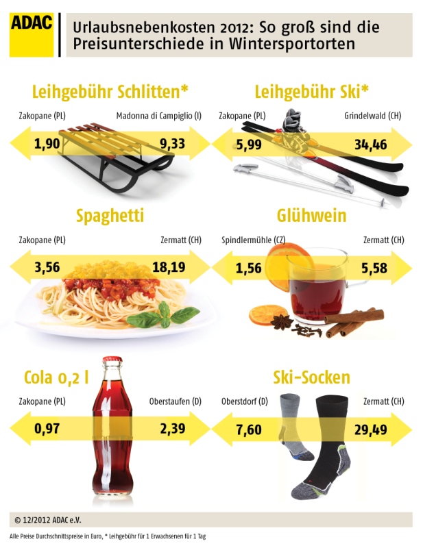 Wenig überraschend schnitt ein Schweizer Skiort im Test als teuerster Wintersportort als Testverlierer ab. In Zermatt (Testverlierer) müssen Urlauber für eine Portion Spaghetti Bolognese beispielsweise mehr als doppelt so viel bezahlen (18 Euro) wie in Garmisch (7 Euro). Aber auch andere Produkte sind in Zermatt sehr teuer, denn ein fiktiver Warenkorb mit 31 Produkten kostetete dort mit insgesamt 570 Euro ebenfalls mehr als das Doppelte im Vergleich zum günstigsten Skiort Spindlermühle im tschechischen Riesengebirge (225 Euro). In die Rubrik „sehr teuer“ stuften die ADAC-Tester darüber hinaus auch noch die namhaften Orte Grindelwald, Samnaun, Ischgl, Lech und Val d’Isère ein. Zu den „sehr günstigen“ Orten zählten bei dem Test unter anderem auch die deutschen Wintersportorte Oberwiesenthal, Bayrischzell und Oberstdorf. Auch ein Skiurlaub im polnischen Zakopane schont nach den Testergebnissen die Urlaubskasse erheblich.
