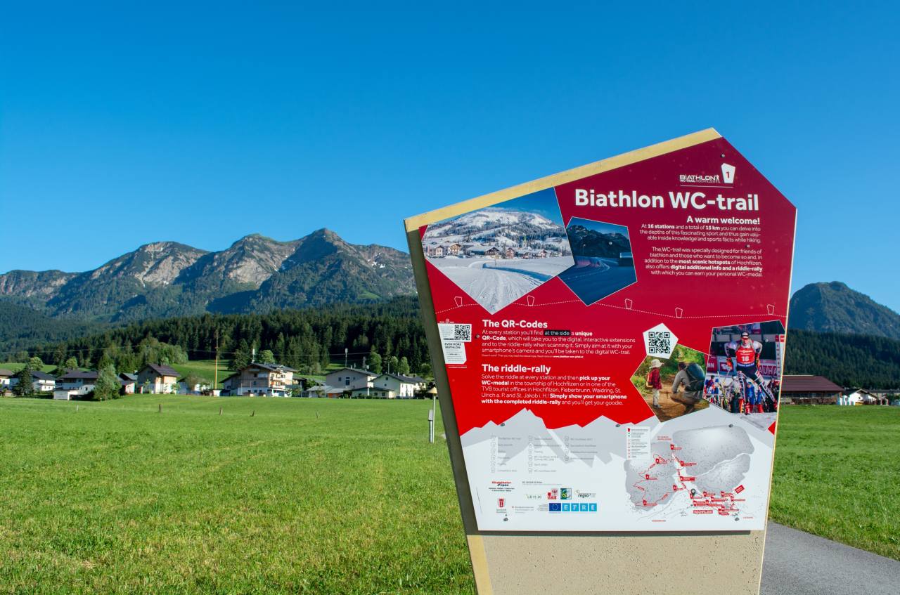 Start ist im Dorfzentrum von Hochfilzen. Der Themenweg mit seinen 16 Stationen ist bestens für Familien geeignet und weckt den kindlichen Forscherdrang. Er führt quer durch die Tiroler Bilderbuchlandschaft, durch die sich im Winter die bekannten Loipen schlängeln, auf denen auch internationale Spitzensportler anzutreffen sind. Ein absolutes Highlight ist das Langlauf- und Biathlonzentrum. Spätestens hier im Trainings- und Olympiastützpunkt der ÖSV-Athleten schaltet sich das Kopfkino ein und Wettkampfatmosphäre wird greifbar, wenn man auf der Tribüne steht. Nationalkader aus Deutschland, Italien, Frankreich, der Schweiz und vielen anderen Ländern kommen, um sich hier auf die Saison vorzubereiten. Die Indoor-Schießanlage mit Laufband und eine asphaltierte Rollskibahn fürs Sommertraining bieten optimale Bedingungen.