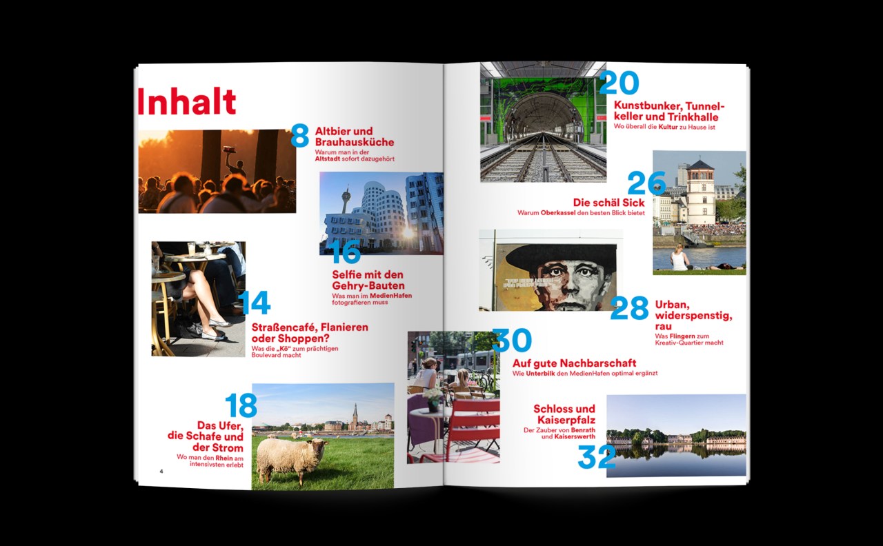 Im Zuge der Einführung der neuen Stadtmarke hat die Düsseldorf Tourismus GmbH ihren offiziellen Stadtführer grundlegend überarbeitet – inhaltlich wie optisch. Das neu entwickelte Magazin ist ein kurzweiliger Begleiter, um die wichtigsten touristischen Zonen der Stadt zu entdecken. Das Zentrum wird repräsentiert durch Altstadt, MedienHafen, Königsallee und Rheinufer. Auf weiteren Doppelseiten folgen die wichtigsten Stadtteile von Oberkassel bis Kaiserswerth. Zudem gibt es einen Sonderteil zum Thema Kunst und Kultur.