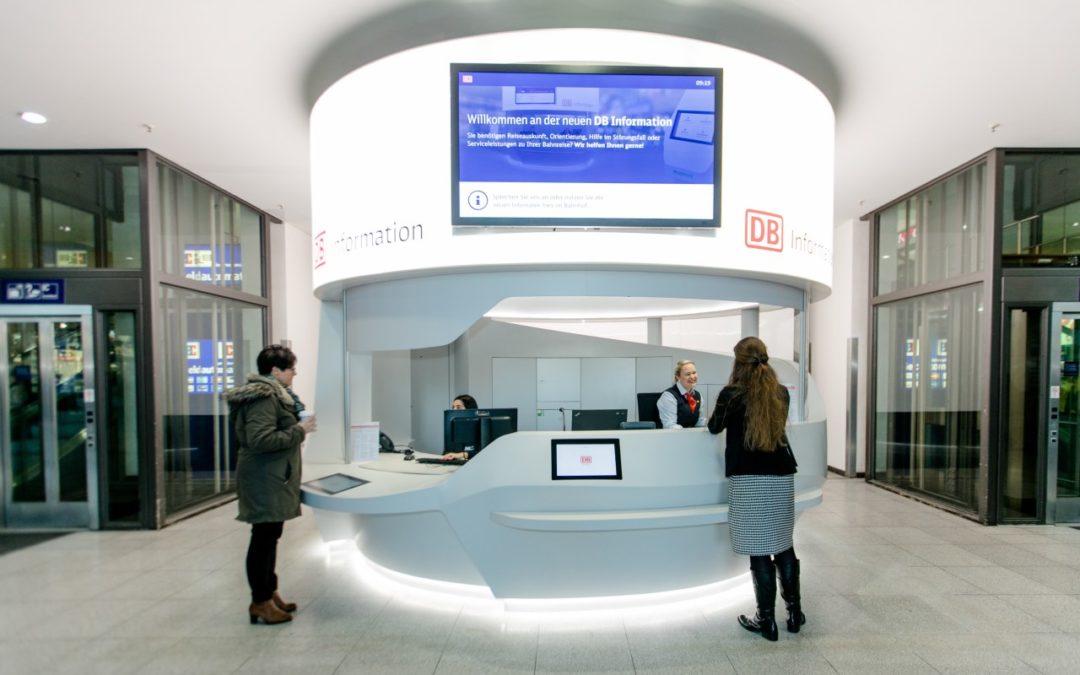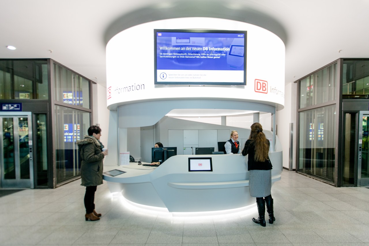 Auf einem großen Monitor sind bereits von weitem Informationen zu örtlichen Besonderheiten sichtbar. Kundenmonitore unterstützen die persönliche Beratung. Ein leuchtendes Dach erleichtert die Auffindbarkeit; die Unterfahrbarkeit des Tresens für Rollstuhlfahrer ist eine große Hilfe bei der persönlichen Beratung eingeschränkter Reisender. Neu sind auch Selbstbedienungsterminals in der Ost-, Mittel- und Westhalle, an denen sich Reisende im Bahnhof orientieren, Bescheinigungen bei Verspätungen selbst ausdrucken oder eine Mobilitätshilfe bestellen können.