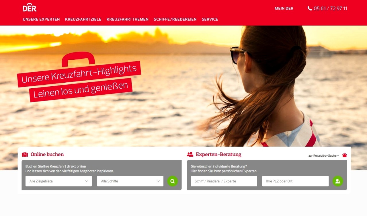 Die Reisebürokette DER Reisebüro berät künftig auch im Netz rund um das Thema Kreuzfahrten. Musste sich der Kunde bis dato entweder für ein Onlineportal oder für ein Reisebüro entscheiden, verbindet das neue Informations- und Buchungsportal www.der-kreuzfahrten.com nun beides: Zum einen erhalten Kunden umfassende Informationen zu beliebten Schiffen, Reedereien, Kreuzfahrtzielen und Themenreisen. Zum anderen können sie über eine Expertensuche anhand verschiedener Kriterien, wie Name des Schiffs oder des Experten, Postleitzahl und Ort, aus rund 200 geschulten DER Kreuzfahrtprofis den passenden finden, der das jeweilige Wunsch-Schiff bereits persönlich kennt, offene Fragen beantworten und wertvolle Tipps geben kann. „Unser neues Portal bringt das Knowhow unserer DER Kreuzfahrtprofis ins Netz“, erklärt Andreas Heimann, Geschäftsführer DER Reisebüro. „Damit verbinden wir die On- und Offline-Welt und ergänzen die Onlinebuchung um individuelle, persönliche Beratung.“