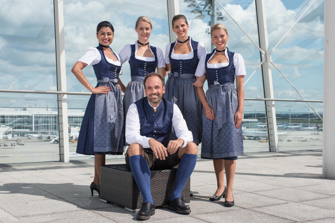 Für die Lufthansa Mitarbeiter der Fluggastbetreuung im Terminal 2 ist es seit Jahren Tradition, während der Wiesnzeit die Fluggäste in Tracht zu begrüßen. Neben der Lufthansa Uniform dürfen die Damen Dirndl, die Herren Trachtenanzüge tragen. Die Service-Mitarbeiter der Lufthansa First Class-Lounges zeigen sich in einer schwarz-goldenen Tracht.