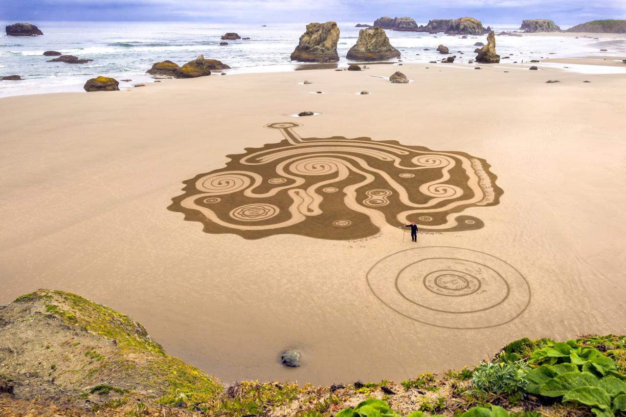 Als Denny Dyke 2011 damit begann, Sandlabyrinthe an den Stränden der südlichen Küste Oregons zu zeichnen, waren die Entwürfe persönlich und dienten zur eigenen Meditation. Acht Jahre später haben sich seine Zeichnungen zu einem beliebten öffentlichen Kunstprojekt entwickelt, das nicht nur unzählige Besucher nach Bandon zieht, sondern auch zum Mitmachen animiert. So besteht das Team um den Künstler mittlerweile aus mehr als 20 Freiwilligen, die ihn zu unterschiedlichen Terminen unterstützen. Als „Leinwand“ für seine spontanen Zeichnungen dient Denny Dyke der nasse Sand, den ihm die Ebbe hinterlässt. Für die Kreation eines Traumfeldes – wie es der Künstler selbst nennt – benötigt er im Durchschnitt 45 Minuten bis zu einer Stunde. Anschließend haben die Zuschauer und Besucher bis zu fünf Stunden Zeit, um das Labyrinth zu bewundern oder es abzulaufen ehe es wieder vom Meer verschluckt wird.