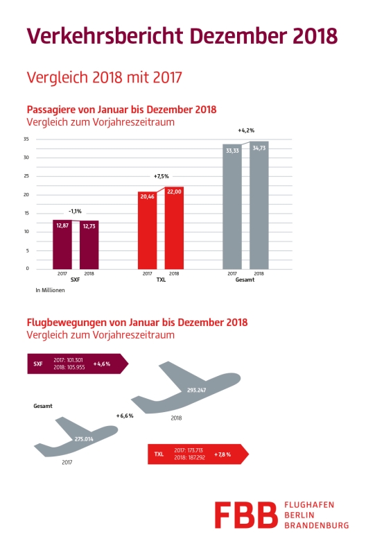 Von Januar bis Dezember 2018 flogen 34.726.367 Passagiere ab Schönefeld und Tegel. Das ist ein Plus von 4,2 Prozent im Vergleich zum Vorjahr und neuer Passagierrekord. In Schönefeld starteten und landeten 12.725.937 Passagiere (-1,1 Prozent). Ab Tegel flogen 22.000.430 Fluggäste (+7,5 Prozent).