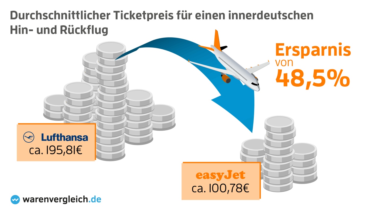 Das Verbraucherportal warenvergleich.de hat anläßlich der Ankündigung von easyjet, ab Anfang Januar 2018 auch innerdeutsche Ziele anzufliegen, einen Preisvergleich zwischen Easyjet und Lufthansa-Tickets auf bestimmten innerdeutschen Strecken gemacht.