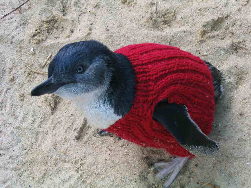 Die rund 120 Kilometer von Melbourne entfernte Halbinsel Phillip Island beherbergt eine der beliebtesten Sehenswürdigkeiten Australiens: Jeden Abend watscheln Tausende von Pinguinen nach ihrem Beutezug im Meer über den Strand zurück in die Dünen zu Ihren Nestern. Das natürliche Habitat wurde zuletzt im Jahr 2001 durch einen Öl-Unfall bedroht. Nach Öl-Kontakt schafften es viele Tiere zwar meist zum Ufer, waren jedoch für die aufwändige Reinigungsprozedur zu schwach. Von den 438 ölverschmierten Pinguinen konnten ganze 96 Prozent erfolgreich nach Pullover-Einsatz und Reinigungsbehandlung wieder ausgewildert werden. Der Strickpullover hat zwei Funktionen: Zuerst wärmt er die geschwächten Tiere. Und er verhindert, dass das Öl über den Schnabel in den Magen des Vogels gelangt. Nach Säuberung des Gefieders kann die Regeneration der Pinguine mehrere Tage in Anspruch nehmen. Zunächst geht es um Stressabbau. Dann müssen die Vögel wieder körpereigenes wasserabweisendes Öl für ihre Federn produzieren können. Nach bestandenem Schwimmtest werden die Pinguine aus der Wildtier-Klinik entlassen. Bei Bedarf helfen die Tierschützer von Phillip Island auch über die Insel- und Landesgrenzen hinaus: So kamen beispielsweise 2011 nach der Havarie des Frachters Rena in Neuseeland Pinguin-Pullover von Phillip Island zum Einsatz.