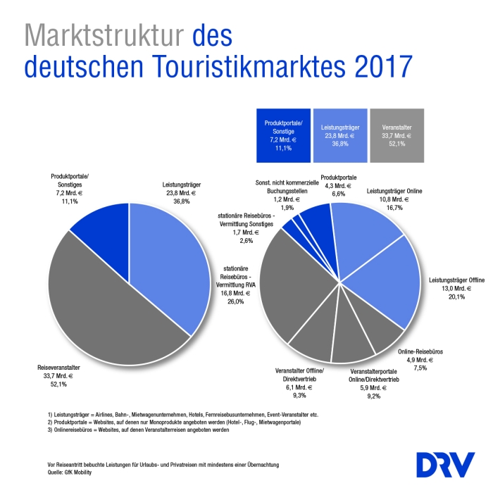 2. 36,8 Prozent der Gesamtausgaben von fast 65 Milliarden Euro und damit 23,8 Milliarden Euro (Vorjahr 21,7 Milliarden Euro) werden direkt bei Fluggesellschaften, Bahn-, Hotel und Mietwagenanbietern gebucht – den sogenannten Leistungsträgern. Zwei Drittel – und damit der Löwenanteil – dieses Umsatzes entfällt auf Hotelbuchungen.