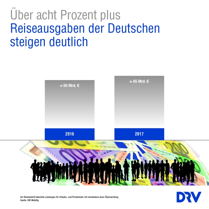Urlaub genießt bei den Deutschen höchste Priorität bei den privaten Konsumausgaben – das belegt die jetzt vom Deutschen Reiseverband (DRV) vorgelegte Bilanz des Reisejahres 2017: Für ihre Urlaubs- und Privatreisen gaben die Deutschen im vergangenen Jahr insgesamt rund 90,9 Milliarden Euro aus – einschließlich der Ausgaben vor Ort im Urlaubsland. Von dieser Gesamtsumme wurden Reiseleistungen in Höhe von 64,7 Milliarden Euro vor Reiseantritt in Deutschland gebucht – ein Plus von 8,2 Prozent im Vergleich zum Vorjahr, so die aktuellen Auswertungen des Marktforschungsunternehmens GfK für den DRV. In dieser Summe sind alle Ausgaben der Deutschen für pauschal und individuell gebuchte Reisen ab einer Übernachtung enthalten.