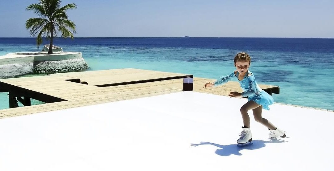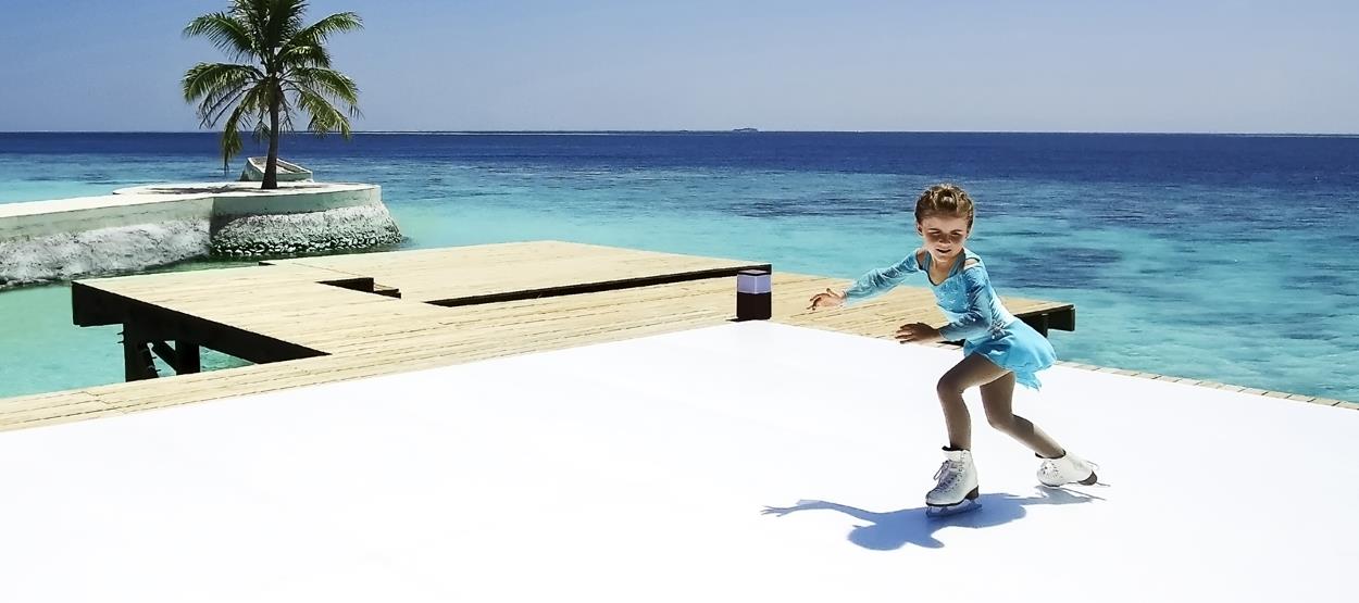 Eis auf den Malediven? Ja, kein April-Scherz! Denn das Jumeirah Vittaveli hat die erste Eisfläche der Malediven eröffnet. Ab jetzt heißt es beim Schlittschuhlaufen nicht mehr frieren bei klirrender Kälte mit dicken Handschuhen und Wollmütze, sondern mit leichter Kleidung über die glitzernde Eisfläche gleiten. Die künstliche Eisfläche wurde in Zusammenarbeit mit der Schweizer Firma Glice konstruiert und bietet bei jeder Temperatur die Möglichkeit zum Eislaufen. Denn sie besteht, im Gegensatz zu herkömmlichen Eislaufbahnen, aus einer synthetischen Konstruktion, die dank einer molekularen Technologie komplett ohne Wasser und auf einem Null-Energie-Niveau funktioniert. Demnach können die Gäste bedenkenlos den Zauber der Eislaufbahn genießen. Und wem es nach einer Weile doch mehr nach Entspannung ist, der schlüpft einfach raus aus den Schlittschuhen, geht zum puderweichen Sandstrand und lässt sich die Sonne auf den Bauch scheinen oder genießt das warme Wasser des Indischen Ozeans.