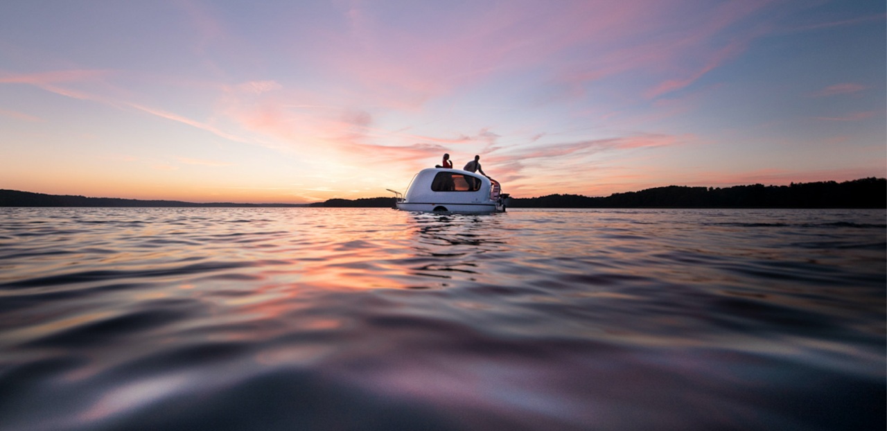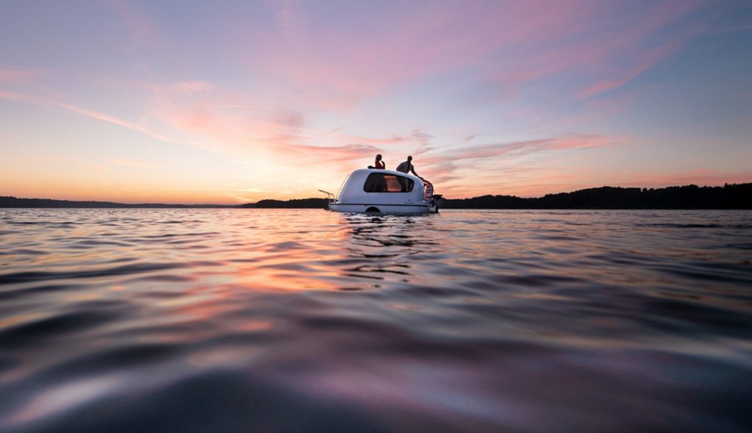 Ausgerechnet eine deutsche Erfindung ist die neuste Attraktion der mittelschwedischen Region Dalarna: Der „Sealander“ ist ein kompakter Camping-Anhänger auf Rädern, der an jedes Auto passt und der auch als kleines Motorboot fungiert. In der Stadt Leksand können Paare seit diesem Frühling die innovative Amphibienkapsel tageweise mieten und darin – ganz ohne Bootsschein – über die Seen Molnbyggen, Styrsjön und den bekannten Siljan-See gleiten. Das Dach lässt sich öffnen, die Badeleiter ist Ehrensache und sogar eine kleine Küche und ein Grill sind mit an Bord. Am Abend lassen sich Bänke und Tisch zu einem Doppelbett zusammenklappen und das Glamping-Abenteuer ist perfekt.