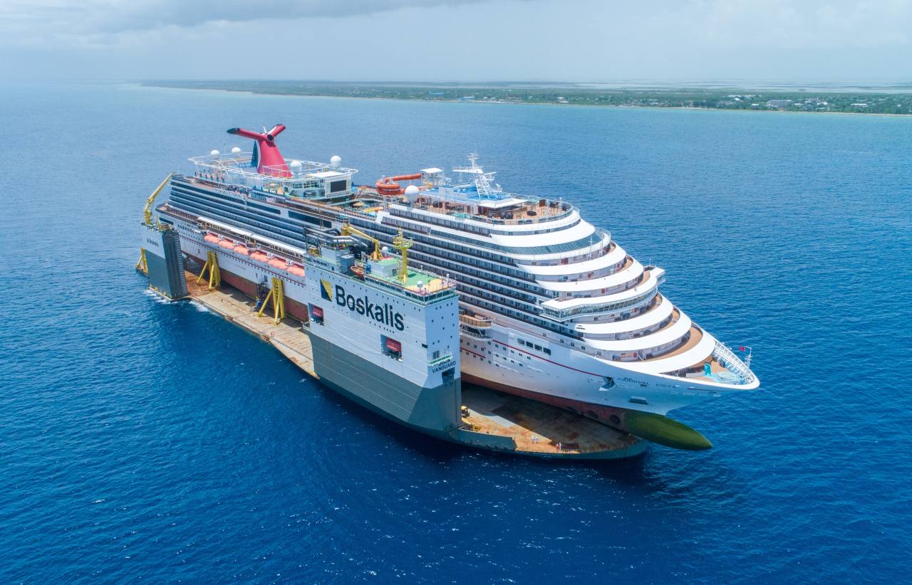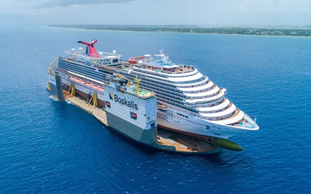 Eine im wahrsten Sinne des Wortes „tragende“ Rolle spielt dabei mit der Boka Vanguard des holländischen Unternehmens Boskalis ein sogenanntes „Halbtaucherschiff“. Das schwimmende Trockendock hat vor wenigen Tagen die Carnival Vista in den Gewässern der Bahamas „huckepack“ genommen. Dabei flutete die Boka Vanguard die Ballastwassertanks, um ihre „Ladefläche“ unter Wasser abzusenken, auf der dann das über 300 Meter lange Kreuzfahrtschiff von Schleppern platziert wurde. Nach dem anschließenden Leerpumpen der Tanks hob sich die Carnival Vista mitsamt dem Schwimmdock wieder über die Wasseroberfläche. Die gesamte Aktion dauerte rund zwölf Stunden.