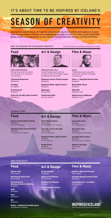 Die Vielfalt von isländischen Künstlern und ihr Schaffen von Musik über Kulinarik bis hin zu Kunst und Design repräsentiert die kreative Landschaft Islands, die die typischen Orte, Räume und Klänge der rauen Insel in sich vereint und Einheimische sowie Reisende immer wieder aufs Neue inspiriert und ihre Kreativität herausfordert. Eine große Bandbreite von renommierten Veranstaltungen wie das etablierte Musikfestival Iceland Airwaves, Dark Music Days bis hin zum Icelandic Photography Festival und Design March – zahlreiche Events in allen Regionen Islands bieten Besuchern die Kreativszene in den Bereichen wie Design, Musik, Kunst, Literatur und Fotografie unmittelbar zu erleben.