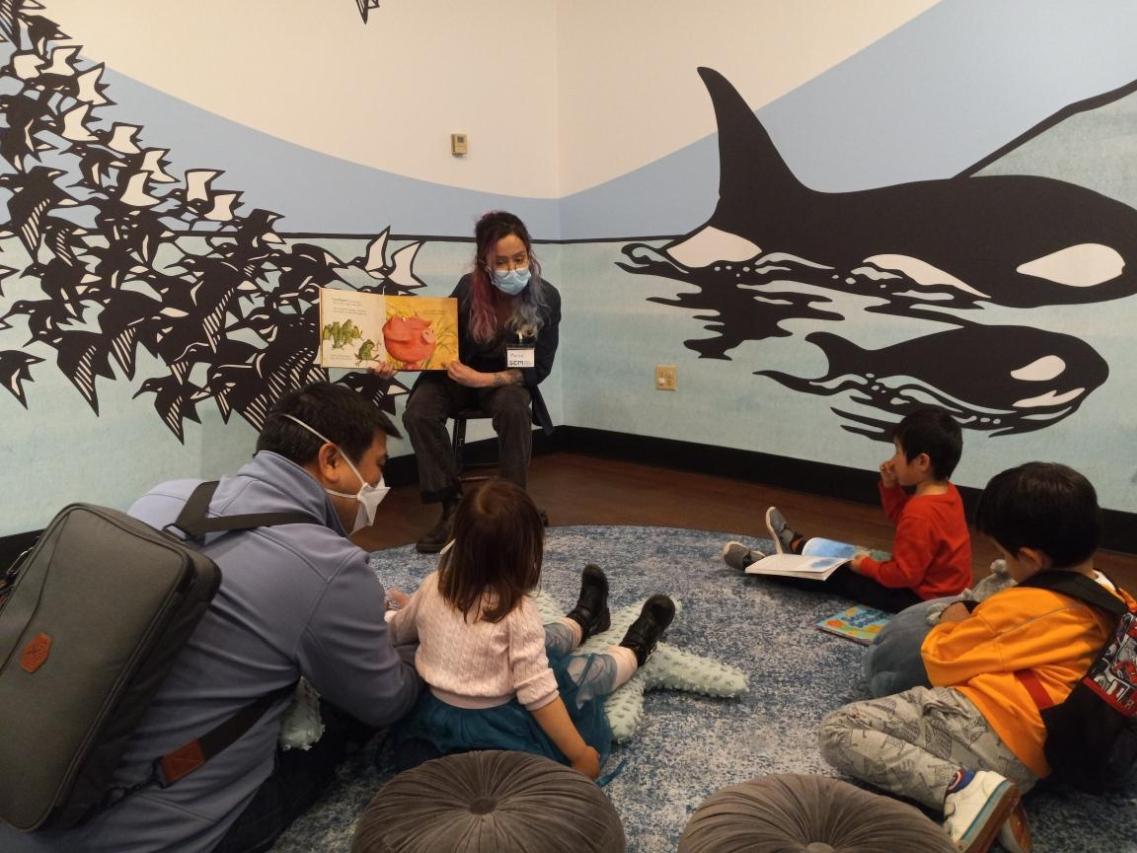 Der Geschichten- und Leseraum „Seattle Reads!“ wurde mit neuen Wandgemälden der Pflanzen- und Tierwelt des Pazifischen Nordwestens geschmückt. Beim Lesen sind die Kinder von Bildern aus dem Buch 1, 2, 3 Salish Sea: A Pacific Northwest Counting Book der lokalen Autorin und Künstlerin Nikki McClure umgeben.