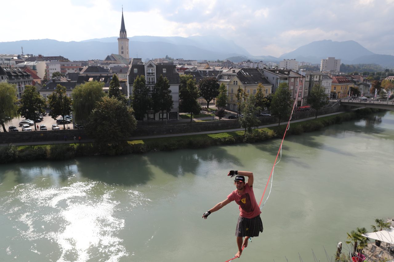 Um sein wagemutiges Vorhaben umsetzen zu können, hatten Schulz und sein Team eine Slackline, also ein hochbelastbares Seil, quer über die Drau gespannt. Vom Dach des Congress Centers Villach bis auf die andere Seite der Drau auf das Dach eines Privathauses betrug die Länge der Slackline rund 120 Meter, die maximale Höhe rund neun Stockwerke!