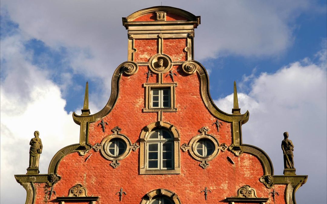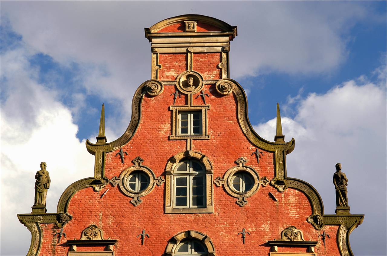 Der Giebel ist dem Sol (Apollo) gewidmet. Der antike Kopf ist seinen Schützlingen den „Honorigen“ gewidmet (nach Marten de Vos mit seiner Serie der Planetengötter). Die Spiralen (Voluten) kennzeichnen einmal die Achse der Tagundnachtgleichen (siehe Viertelkreis, Frühling/Herbst) und der Sonnenwenden (Spirale mit Abgang Winter/ und Abgang Sommer). Dem Entsprechen die beiden Figuren der Ecclesia (Mutter Kirche Achse Tagundnachtgleichen) und Justitia (Achse Sonnenwenden). Justitia ist weltlich, Ecclesia ist kirchlich.