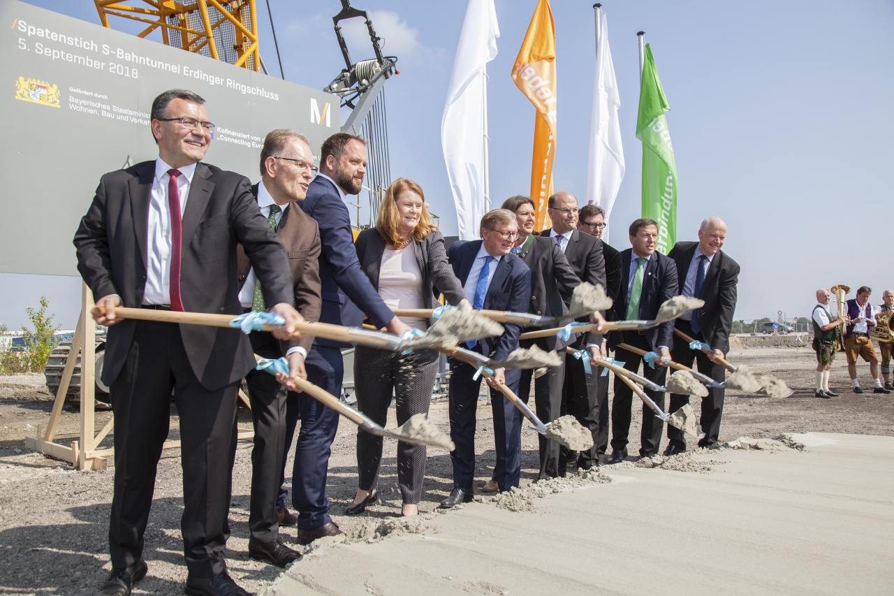 Offizieller Startschuss für den Ausbau des Bahntunnels am Flughafen München: Der bestehende Tunnel, der zurzeit auf Höhe des Terminal 2-Satelliten endet, wird in östlicher Richtung verlängert, um S-Bahnen und Fernzügen künftig das Durchfahren des Airports zu ermöglichen.